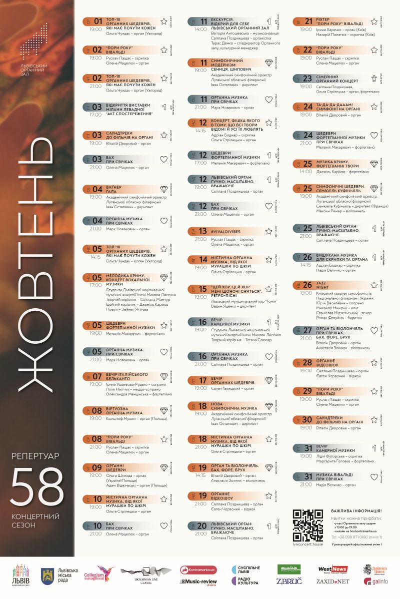 У жовтні у Львівському органному залі відбудеться понад 40 подій. Серед них – понад три десятки органних концертів, девʼять камерних вечорів, де звучатиме і скрипка, і фортепіано, й італійське бельканто, і навіть квартет саксофоністів, та чотири великі симфонічні концерти, одним з яких дириґуватиме зірка з Франції.