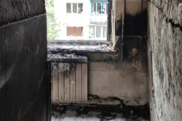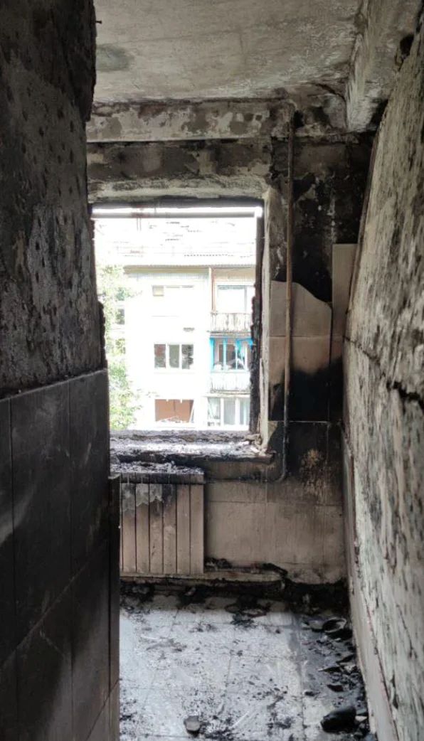 На фото з імовірно квартири юристки видно, що приміщення повністю згоріло, стіни між кімнатами на межі руйнування, а від ремонту лишилося лише декілька розбитих плиток на стіні.
