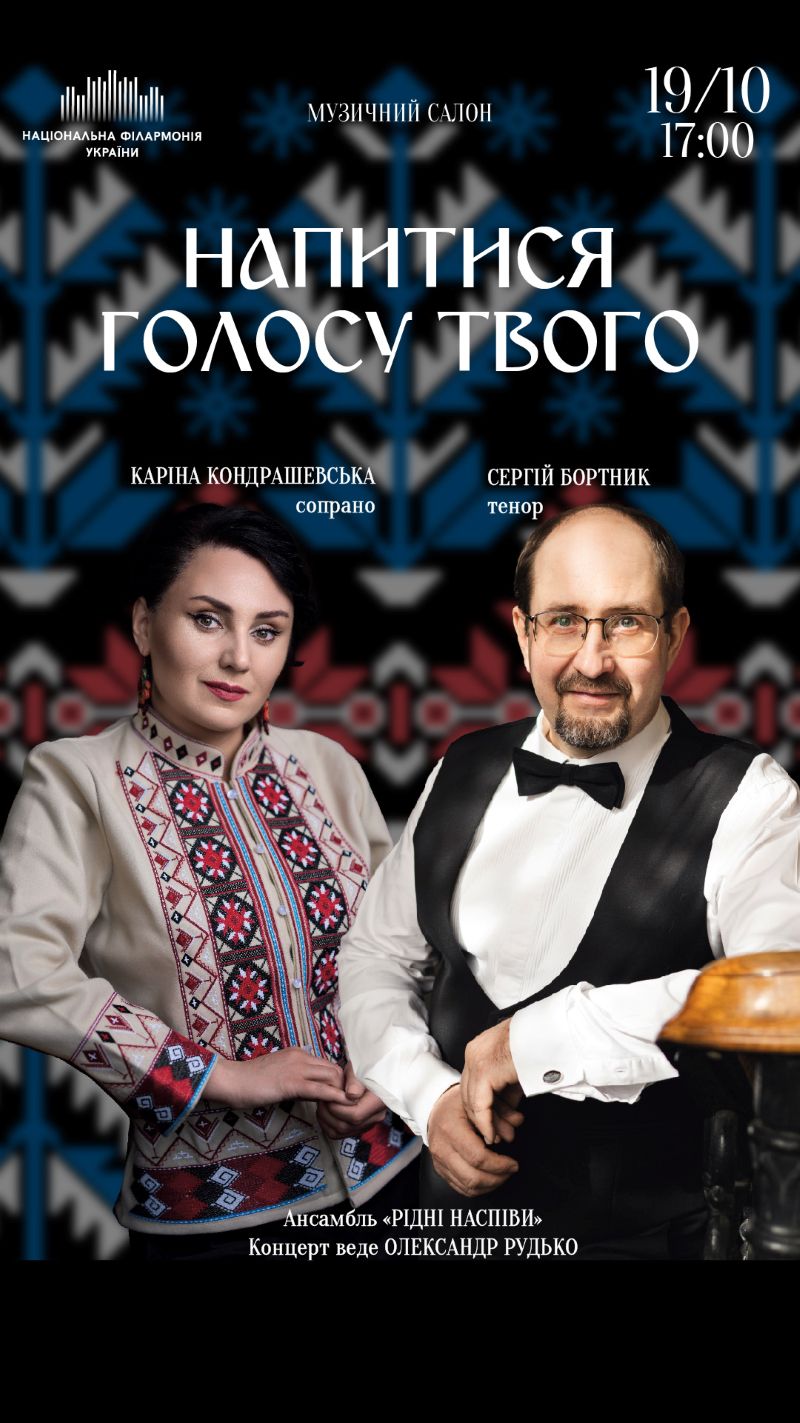 А обдарують слухачів яскравими емоціями «голос» цього вечора та його «інструментальний подих»: солісти Національної філармонії України заслужена артистка України Каріна Кондрашевська і Сергій Бортник та ансамбль «Рідні наспіви» Національної філармонії України, в самому імені якого закладено його творче кредо: пропаганда і поширення української музики.